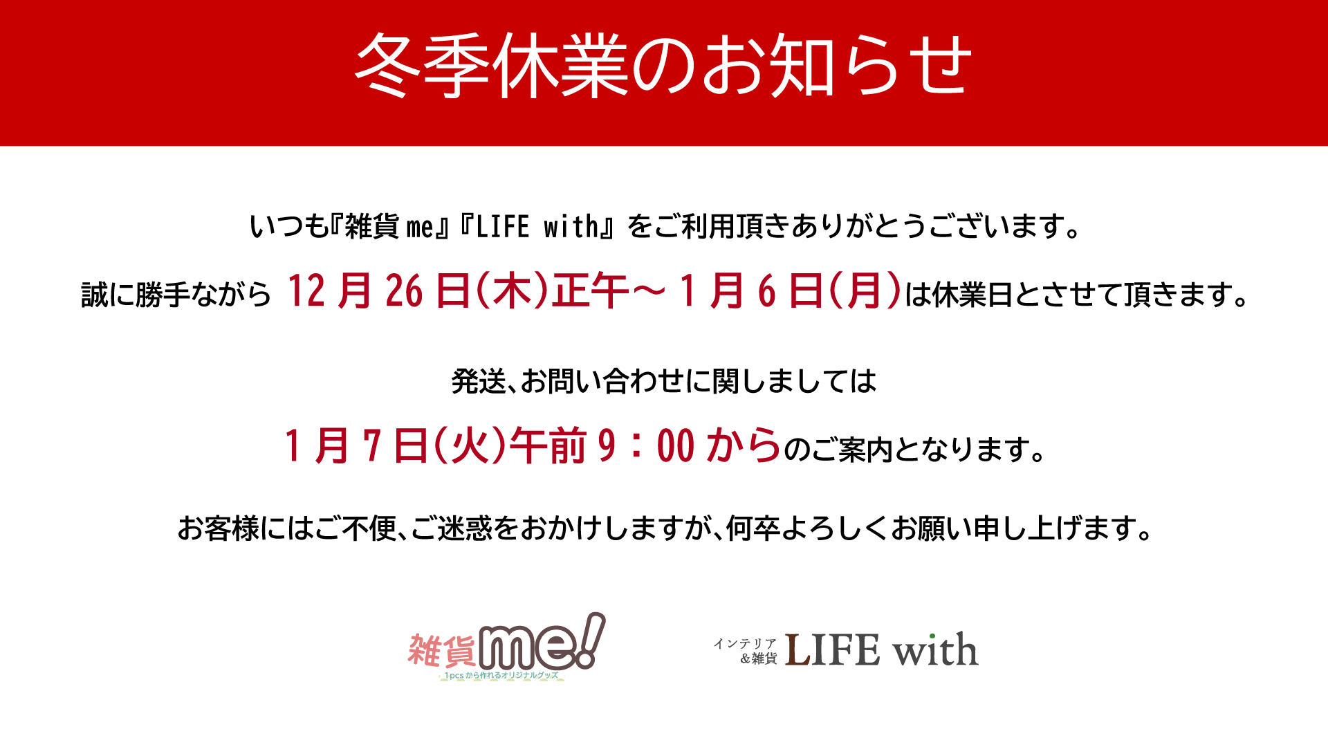 誠に勝手ながら、12月26日(木)正午~1月6日(月)を冬季休業日とさせていただきます。