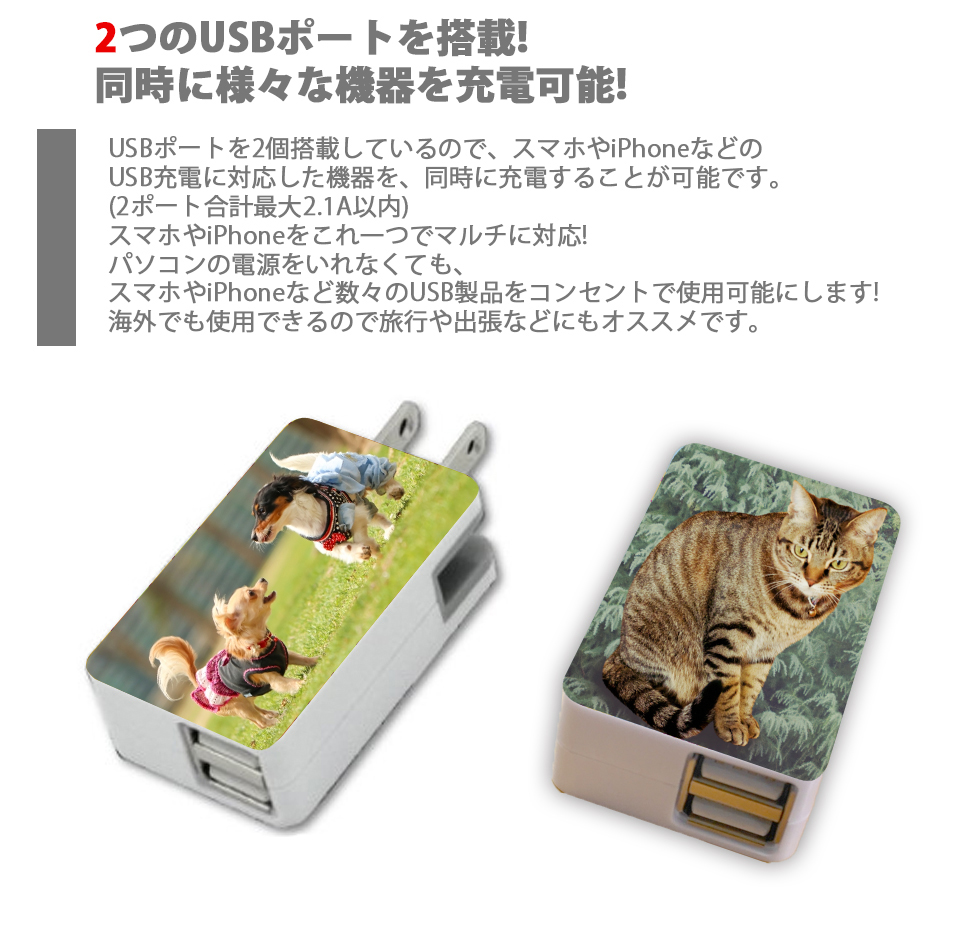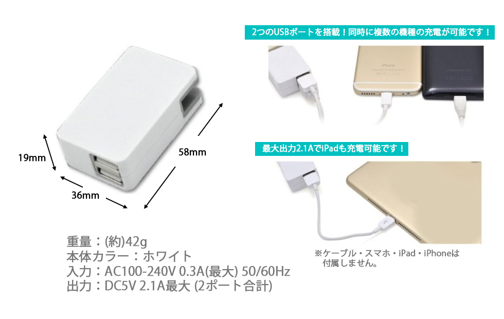 ※USB2ポート合計で2.1Aとなっておりますので、iPadなど高い電力を必要とする機器を充電する際は、