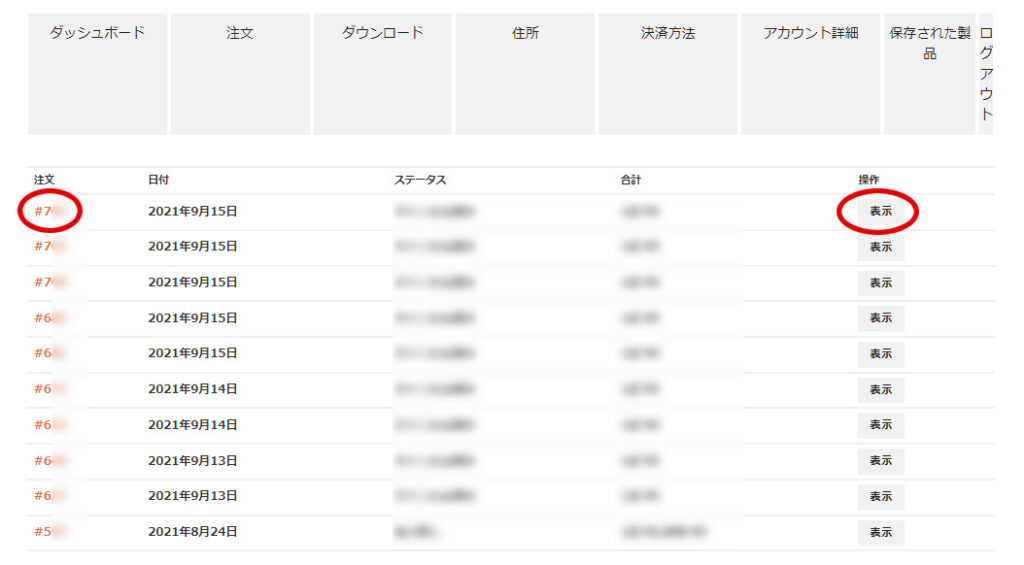 注文番号(#から始まる番号)か、操作の「表示」をクリック